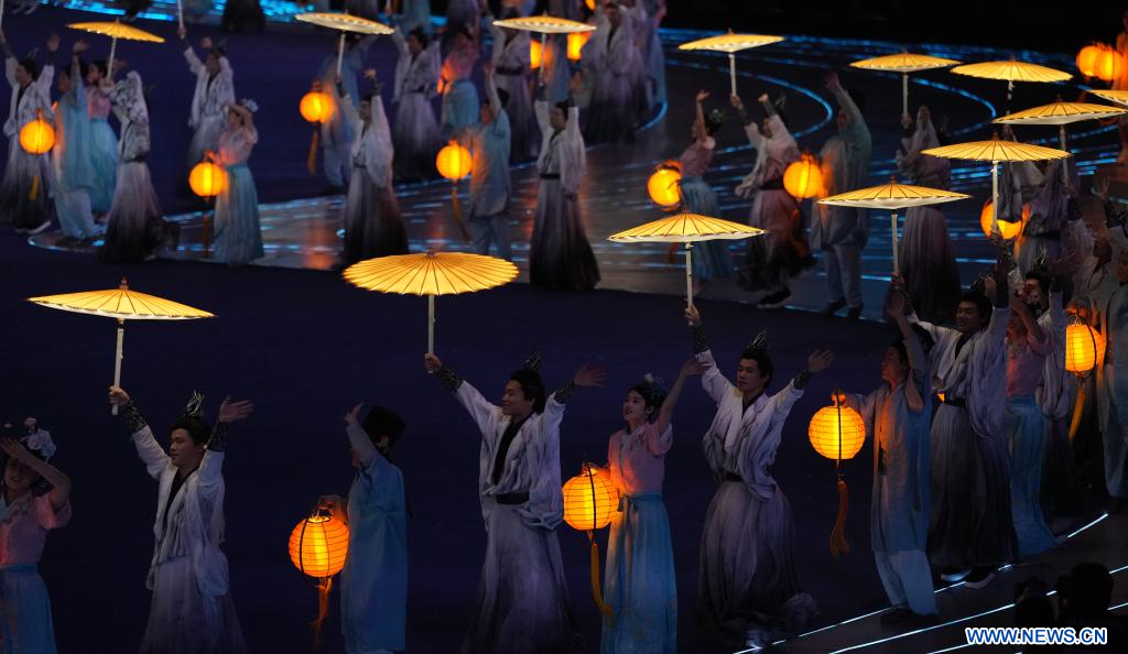 HANGZHOU, 23 septiembre, 2023 (Xinhua) -- Artistas realizan una presentación durante la ceremonia de inauguración de los XIX Juegos Asiáticos, en Hangzhou, en la provincia de Zhejiang, en el este de China, el 23 de septiembre de 2023. (Xinhua/Wan Xiang)