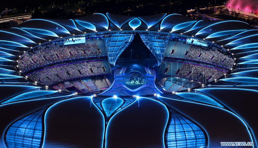 HANGZHOU, 23 septiembre, 2023 (Xinhua) -- Imagen del 23 de septiembre de 2023 del Centro Deportivo Olímpico de Hangzhou previo a la ceremonia de inauguración de los XIX Juegos Asiáticos, en Hangzhou, en la provincia de Zhejiang, en el este de China. (Xinhua/Cheng Tingting)