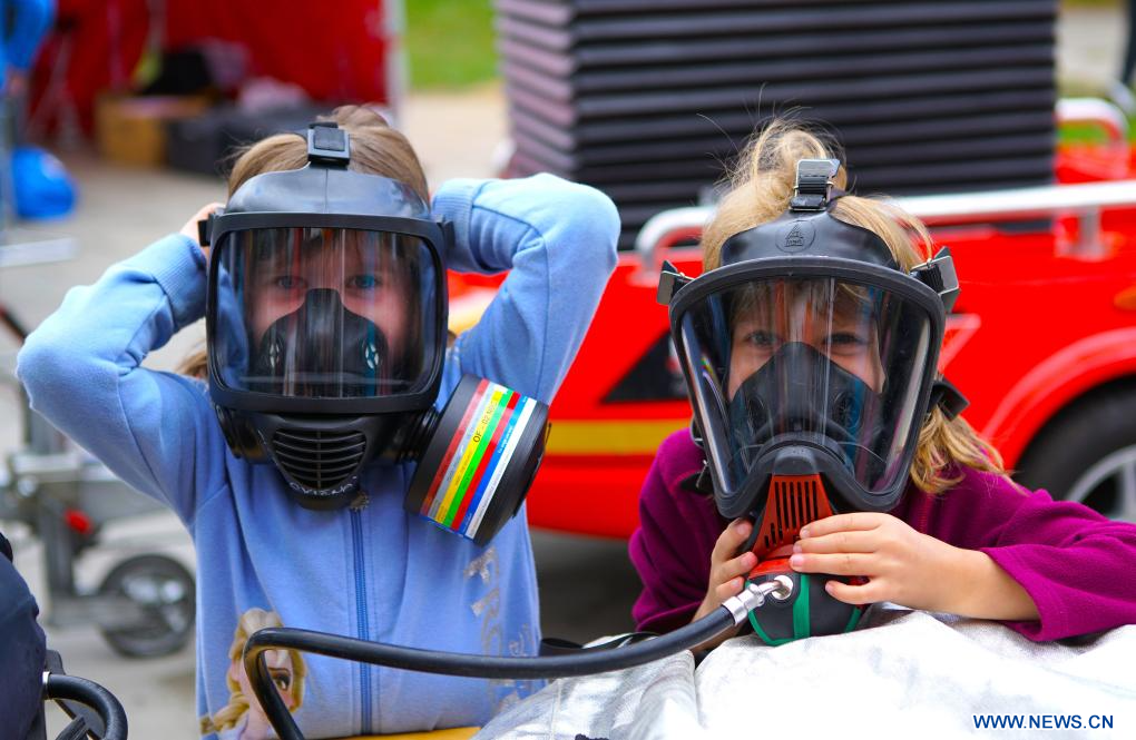 PRAGA, 24 septiembre, 2023 (Xinhua) -- Imagen del 23 de septiembre de 2023 de niñas probándose cascos de la brigada contra incendios durante el evento del Día de los Héroes, en Praga, República Checa. El evento anual que muestra el trabajo de los servicios de rescate integrados en República Checa por medio de piezas exhibidas y actividades prácticas se llevó a cabo en el Recinto Ferial de Praga el sábado. (Xinhua/Dana Kesnerova)
