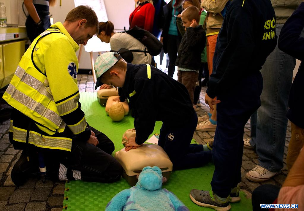 PRAGA, 24 septiembre, 2023 (Xinhua) -- Imagen del 23 de septiembre de 2023 de un niño practicando resucitación cardiaca durante el evento del Día de los Héroes, en Praga, República Checa. El evento anual que muestra el trabajo de los servicios de rescate integrados en República Checa por medio de piezas exhibidas y actividades prácticas se llevó a cabo en el Recinto Ferial de Praga el sábado. (Xinhua/Dana Kesnerova)