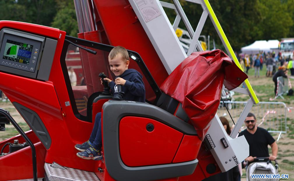 PRAGA, 24 septiembre, 2023 (Xinhua) -- Imagen del 23 de septiembre de 2023 de un niño intentando operar una grúa durante el evento del Día de los Héroes, en Praga, República Checa. El evento anual que muestra el trabajo de los servicios de rescate integrados en República Checa por medio de piezas exhibidas y actividades prácticas se llevó a cabo en el Recinto Ferial de Praga el sábado. (Xinhua/Dana Kesnerova)