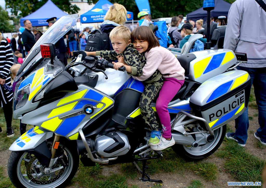 PRAGA, 24 septiembre, 2023 (Xinhua) -- Imagen del 23 de septiembre de 2023 de un niño y una niña probando una motocicleta de policía durante el evento del Día de los Héroes, en Praga, República Checa. El evento anual que muestra el trabajo de los servicios de rescate integrados en República Checa por medio de piezas exhibidas y actividades prácticas se llevó a cabo en el Recinto Ferial de Praga el sábado. (Xinhua/Dana Kesnerova)