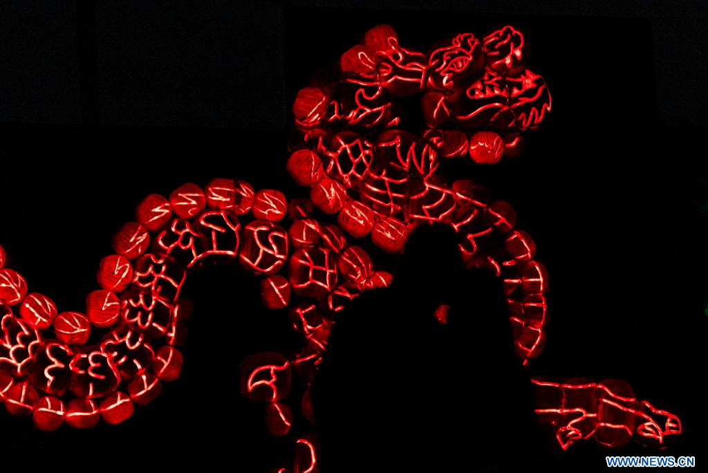 MILTON, 24 septiembre, 2023 (Xinhua) -- Imagen del 23 de septiembre de 2023 de personas observando un tallado de calabaza durante el evento Calabazas Después del Anochecer 2023, en Milton, Ontario, Canadá. Con más de 10.000 calabazas talladas a mano, el evento anual de Halloween al aire libre de Canadá se celebra del 23 de septiembre al 31 de octubre. (Xinhua/Zou Zheng)