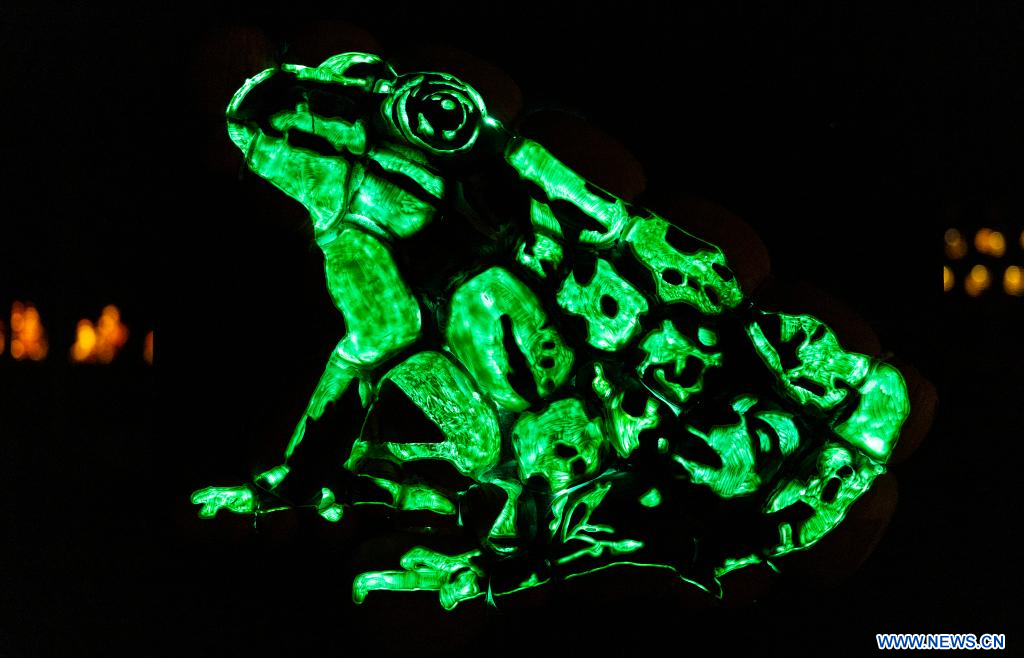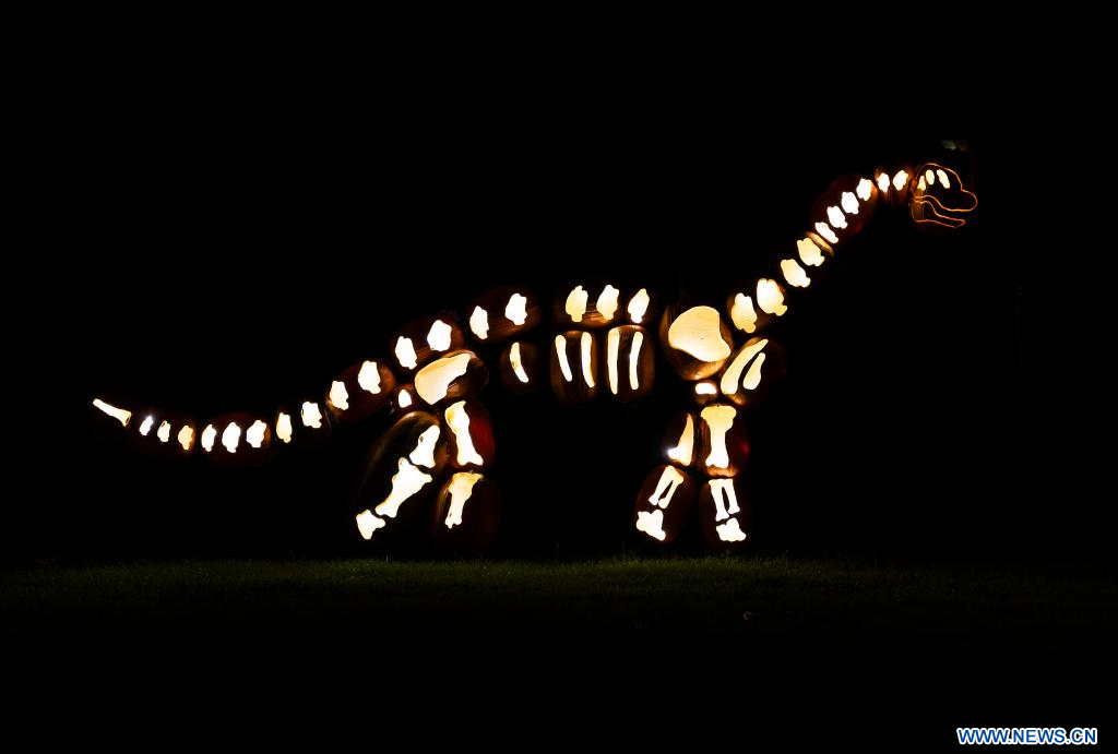MILTON, 24 septiembre, 2023 (Xinhua) -- Imagen del 23 de septiembre de 2023 de un tallado de calabaza visto durante el evento Calabazas Después del Anochecer 2023, en Milton, Ontario, Canadá. Con más de 10.000 calabazas talladas a mano, el evento anual de Halloween al aire libre de Canadá se celebra del 23 de septiembre al 31 de octubre. (Xinhua/Zou Zheng)