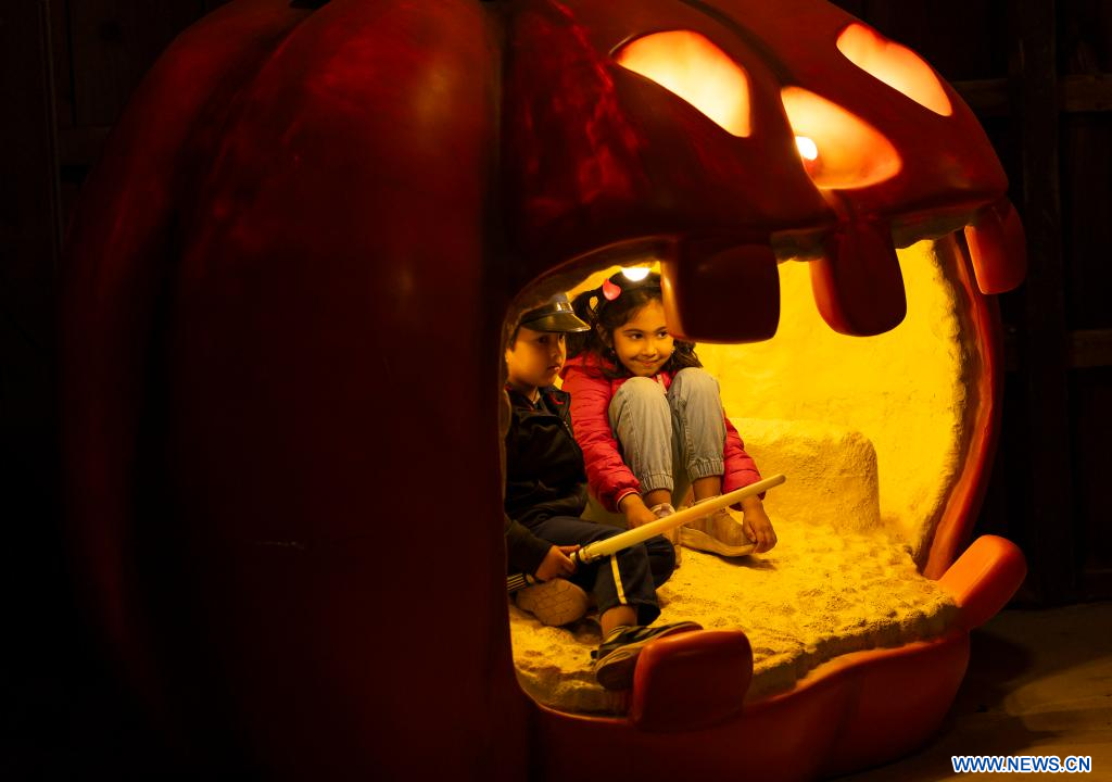 MILTON, 24 septiembre, 2023 (Xinhua) -- Imagen del 23 de septiembre de 2023 de niños posando para fotografías en una calabaza de Halloween durante el evento Calabazas Después del Anochecer 2023, en Milton, Ontario, Canadá. Con más de 10.000 calabazas talladas a mano, el evento anual de Halloween al aire libre de Canadá se celebra del 23 de septiembre al 31 de octubre. (Xinhua/Zou Zheng)