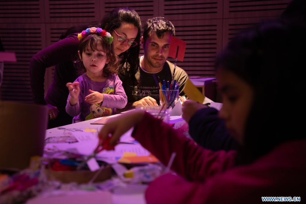 BUENOS AIRES, 24 septiembre, 2023 (Xinhua) -- Imagen del 23 de septiembre de 2023 de Lucía (i), de 3 años, participando junto a sus padres en una actividad recreativa para niños y niñas en el Museo Moderno durante "La Noche de los Museos", en Buenos Aires, Argentina. Miles de vecinos y turistas vibraron en la ciudad argentina de Buenos Aires con una nueva edición de La Noche de los Museos, actividad que permitió celebrar la cultura con más de 290 establecimientos y propuestas artísticas que se extendieron desde la noche del sábado hasta la madrugada del domingo. (Xinhua/Martín Zabala)