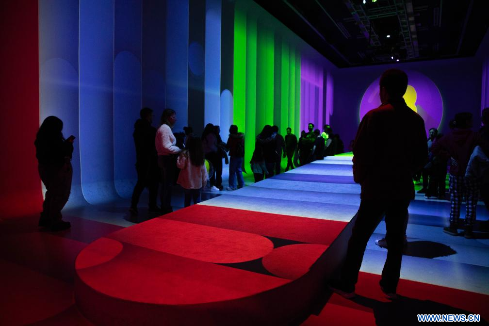 BUENOS AIRES, 24 septiembre, 2023 (Xinhua) -- Imagen del 23 de septiembre de 2023 de personas participando en una experiencia inmersiva en el Centro Cultural Kirchner durante "La Noche de los Museos", en Buenos Aires, Argentina. Miles de vecinos y turistas vibraron en la ciudad argentina de Buenos Aires con una nueva edición de La Noche de los Museos, actividad que permitió celebrar la cultura con más de 290 establecimientos y propuestas artísticas que se extendieron desde la noche del sábado hasta la madrugada del domingo. (Xinhua/Martín Zabala)