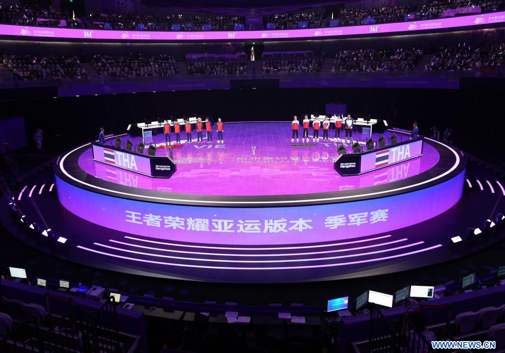 HANGZHOU, 26 septiembre, 2023 (Xinhua) -- El equipo de Tailandia (d), y el equipo de Vietnam, son vistos previo al partido por la medalla de bronce de Deportes Electrónicos de la Versión Arena de Valor de Juegos Asiáticos en los XIX Juegos Asiáticos, en Hangzhou, en la provincia de Zhejiang, en el este de China, el 26 de septiembre de 2023. (Xinhua/Han Chuanhao)