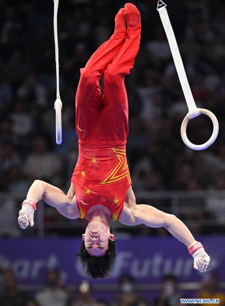 HANGZHOU, 26 septiembre, 2023 (Xinhua) -- Zhang Boheng, de China, compite en los anillos de la Final Masculina del All-Around de Gimnasia Artística en los XIX Juegos Asiáticos, en Hangzhou, en la provincia de Zhejiang, en el este de China, 26 de septiembre de 2023. (Xinhua/Cheng Min)