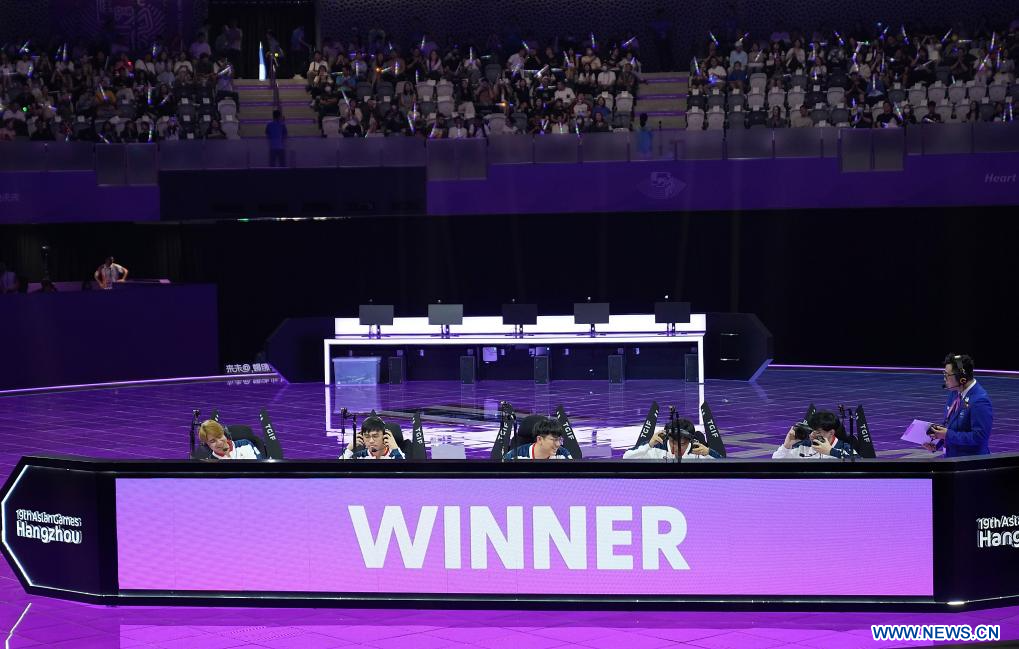 HANGZHOU, 26 septiembre, 2023 (Xinhua) -- El equipo de Tailandia celebra después del partido por la medalla de bronce de Deportes Electrónicos de la Versión Arena de Valor de Juegos Asiáticos en los XIX Juegos Asiáticos, en Hangzhou, en la provincia de Zhejiang, en el este de China, el 26 de septiembre de 2023. (Xinhua/Han Chuanhao)
