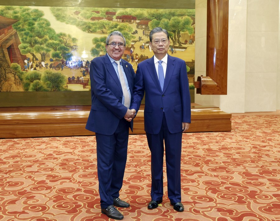 El presidente del Comité Permanente de la Asamblea Popular Nacional, Zhao Leji, sostiene conversaciones con el presidente del Parlamento Centroamericano, Amado Cerrud, en el Gran Palacio del Pueblo en Beijing, capital de China, el 22 de septiembre de 2023. (Xinhua/Liu Weibing)
