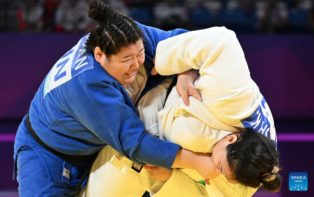 HANGZHOU, 27 septiembre, 2023 (Xinhua) -- Xu Shiyan (i), de China, compite contra Kamila Berlikash, de Kazajistán, durante el concurso de equipos mixtos por la Medalla de Bronce de Judo en los XIX Juegos Asiáticos, en Hangzhou, en la provincia de Zhejiang, en el este de China, el 27 de septiembre de 2023. (Xinhua/Li An)
