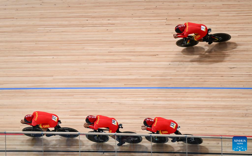 HANGZHOU, 27 septiembre, 2023 (Xinhua) -- Atletas de China compiten durante la final masculina de persecución por equipos de Ciclismo en Pista en los XIX Juegos Asiáticos, en Hangzhou, en la provincia de Zhejiang, en el este de China, el 27 de septiembre de 2023. (Xinhua/Hu Huhu)