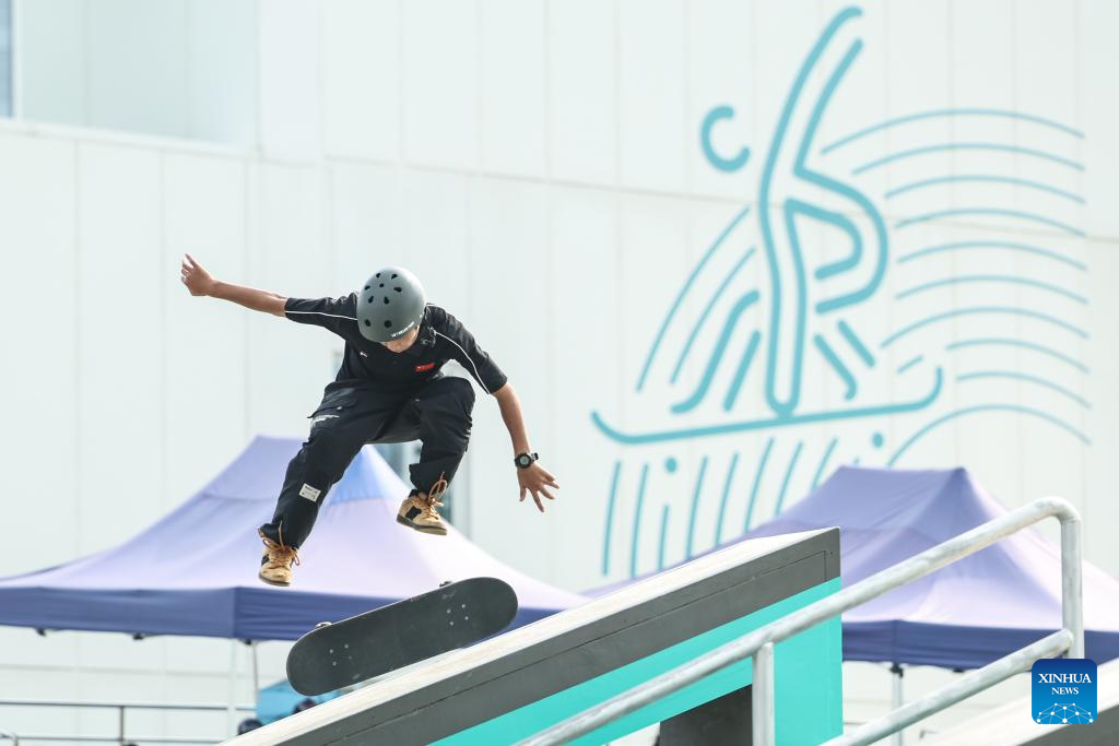 HANGZHOU, 27 septiembre, 2023 (Xinhua) -- Zhang Jie, de China, compite durante la final masculina de Skateboarding Callejero en los XIX Juegos Asiáticos, en Hangzhou, en la provincia de Zhejiang, en el este de China, el 27 de septiembre de 2023. (Xinhua/Pan Yulong)