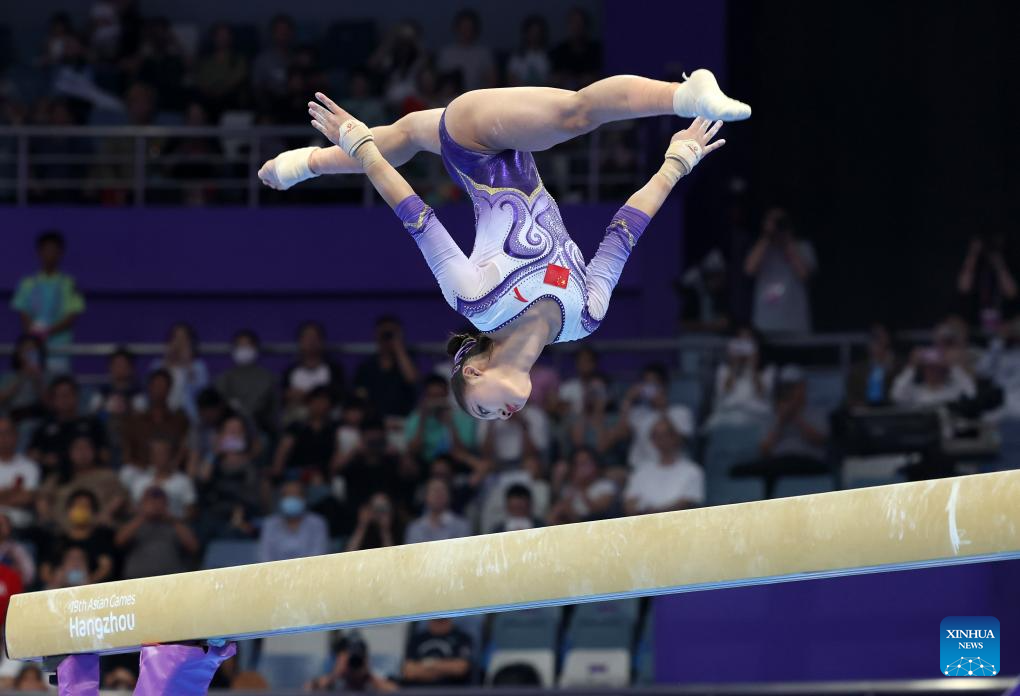 HANGZHOU, 27 septiembre, 2023 (Xinhua) -- Zuo Tong, de China, compite durante la barra de equilibrio de la final femenina del All-Around de Gimnasia Artística en los XIX Juegos Asiáticos, en Hangzhou, en la provincia de Zhejiang, en el este de China, el 27 de septiembre de 2023. (Xinhua/Cheng Tingting)