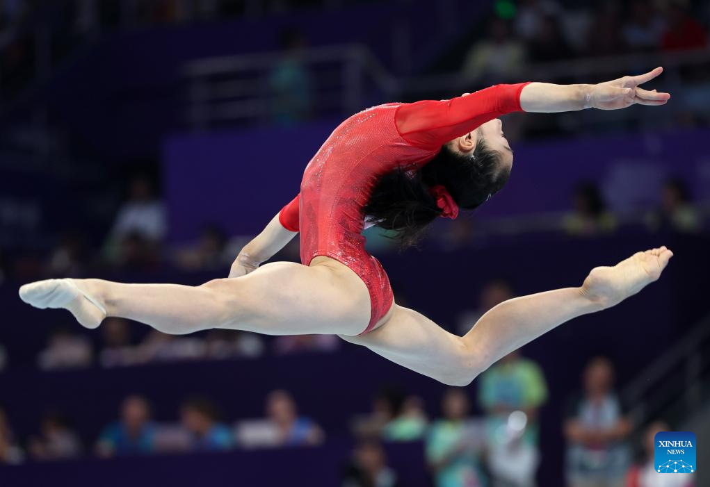 HANGZHOU, 27 septiembre, 2023 (Xinhua) -- Okamura Mana, de Japón, compite durante los ejercicios de suelo de la final femenina del All-Around de Gimnasia Artística en los XIX Juegos Asiáticos, en Hangzhou, en la provincia de Zhejiang, en el este de China, el 27 de septiembre de 2023. (Xinhua/Cheng Tingting)