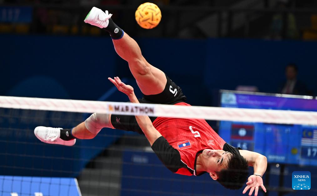 JINHUA, 27 septiembre, 2023 (Xinhua) -- Noum Souvannalith, de Laos, compite durante la semifinal masculina por equipos de Sepak Takraw entre Malasia y Laos en los XIX Juegos Asiáticos, en Jinhua, en la provincia de Zhejiang, en el este de China, el 27 de septiembre de 2023. (Xinhua/Chen Zhonghao)