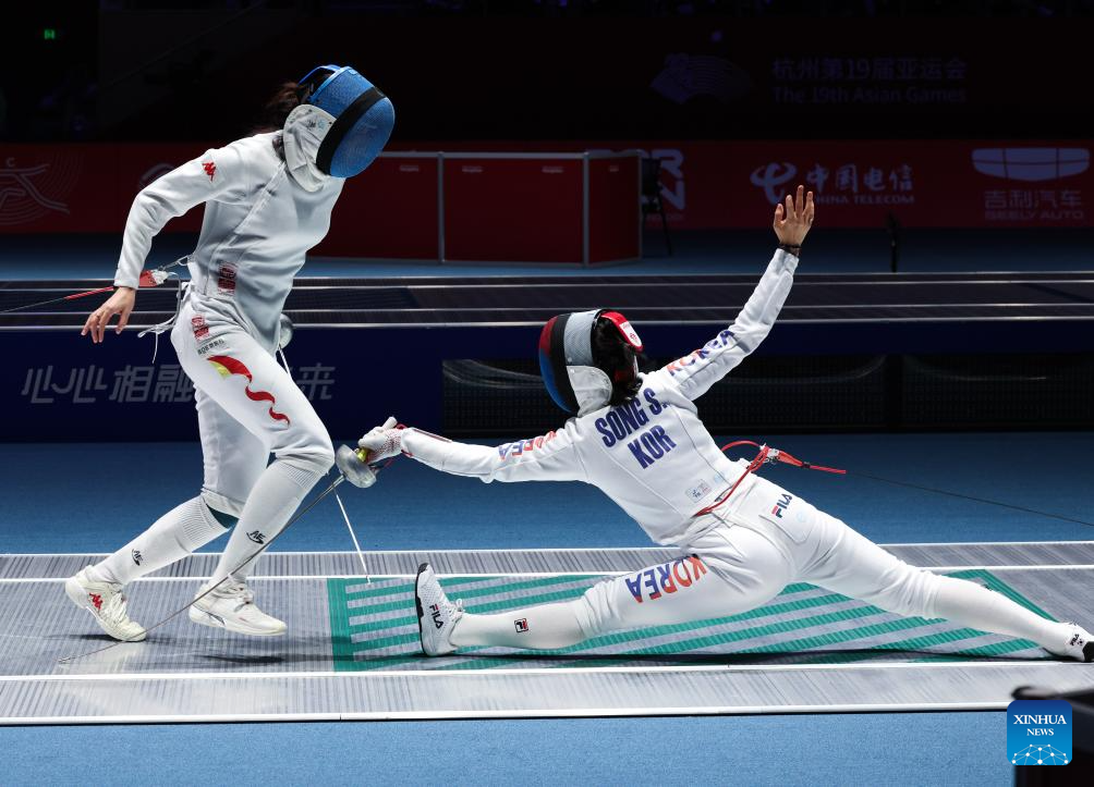 HANGZHOU, 27 septiembre, 2023 (Xinhua) -- Sun Yiwen (i), de China, compite contra Song Sera, de República de Corea, durante la semifinal femenina de espada por equipos de Esgrima en los XIX Juegos Asiáticos, en Hangzhou, en la provincia de Zhejiang, en el este de China, el 27 de septiembre de 2023. (Xinhua/Xu Yu)