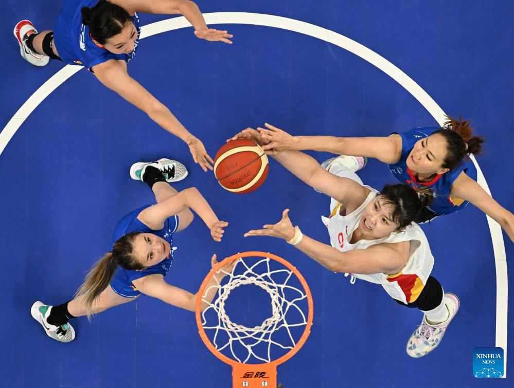 HANGZHOU, 27 septiembre, 2023 (Xinhua) -- Li Yueru (d-abajo), de China, compite durante el partido de la ronda preliminar femenina de Baloncesto entre China y Mongolia en los XIX Juegos Asiáticos, en Hangzhou, en la provincia de Zhejiang, en el este de China, el 27 de septiembre de 2023. (Xinhua/Meng Yongmin)