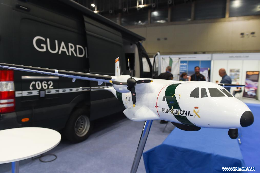 MADRID, 26 septiembre, 2023 (Xinhua) -- Imagen del 25 de septiembre de 2023 de un modelo de avión exhibido durante la Semana de la Integración del Espacio Aéreo de Madrid, en Madrid, España. La Semana de la Integración del Espacio Aéreo de Madrid se lleva a cabo del 25 al 28 de septiembre, centrándose en la gestión del tráfico aéreo y otras áreas. Productos como aeronaves no tripuladas y taxis aéreos y servicios como entrega urgente no tripulada son exhibidos durante el evento. (Xinhua/Gustavo Valiente)