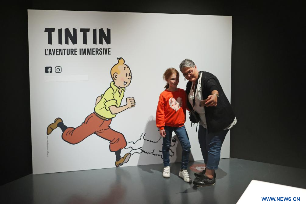 BRUSELAS, 28 septiembre, 2023 (Xinhua) -- Imagen del 27 de septiembre de 2023 de personas posando para una fotografía durante una exposición basada en la serie de historietas "Las Aventuras de Tintín", en Bruselas, Bélgica. Cubriendo una superficie de proyección de 1.600 metros cuadrados, la exposición digital permitió a los visitantes a sumergirse en el mundo de Tintín. (Xinhua/Zhao Dingzhe)