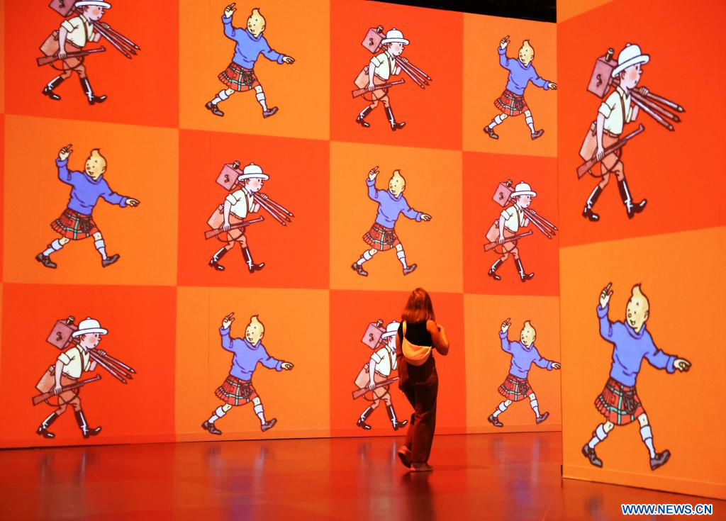BRUSELAS, 28 septiembre, 2023 (Xinhua) -- Imagen del 27 de septiembre de 2023 de una mujer visitando una exposición basada en la serie de historietas "Las Aventuras de Tintín", en Bruselas, Bélgica. Cubriendo una superficie de proyección de 1.600 metros cuadrados, la exposición digital permitió a los visitantes a sumergirse en el mundo de Tintín. (Xinhua/Zhao Dingzhe)