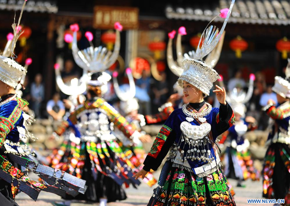 BEIJING, 29 septiembre, 2023 (Xinhua) -- Turistas observan una presentación, en la aldea de la etnia miao de Qianhu de Xijiang, en el distrito de Leishan de la prefectura autónoma de las etnias miao y dong de Qiandongnan, en la provincia de Guizhou, en el suroeste de China, el 29 de septiembre de 2023. El viernes marca el tradicional Festival de Medio Otoño de este año en China, que se celebra de diversas formas, que van desde reuniones familiares con grandes banquetes hasta reuniones públicas con ceremonias tradicionales, actuaciones y la gala del Medio Otoño. (Xinhua/Wu Xianyan)