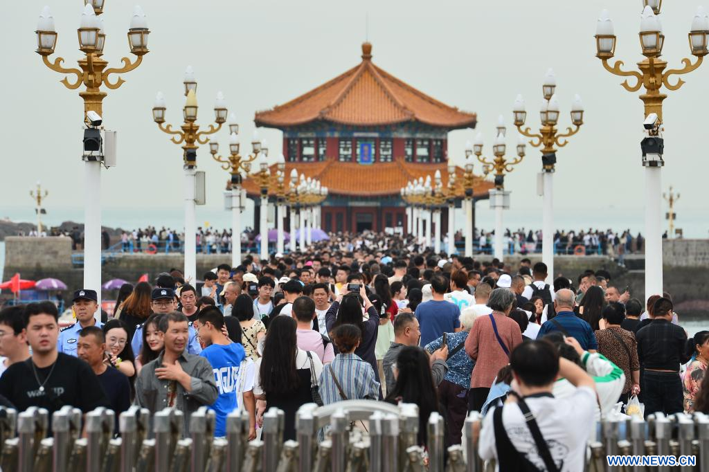 BEIJING, 29 septiembre, 2023 (Xinhua) -- Personas visitan el punto escénico del puente Zhanqiao, en Qingdao, en la provincia de Shandong, en el este de China, el 29 de septiembre de 2023. El viernes marca el tradicional Festival de Medio Otoño de este año en China, que se celebra de diversas formas, que van desde reuniones familiares con grandes banquetes hasta reuniones públicas con ceremonias tradicionales, actuaciones y la gala del Medio Otoño. (Xinhua/Wang Haibin)