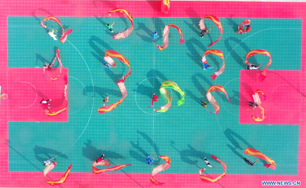 BEIJING, 29 septiembre, 2023 (Xinhua) -- Vista aérea del 29 de septiembre de 2023 de personas interpretando la danza del dragón, en el poblado de Jiazhai de Liaocheng, en la provincia de Shandong, en el este de China. El viernes marca el tradicional Festival de Medio Otoño de este año en China, que se celebra de diversas formas, que van desde reuniones familiares con grandes banquetes hasta reuniones públicas con ceremonias tradicionales, actuaciones y la gala del Medio Otoño. (Xinhua/Zhao Yuguo)