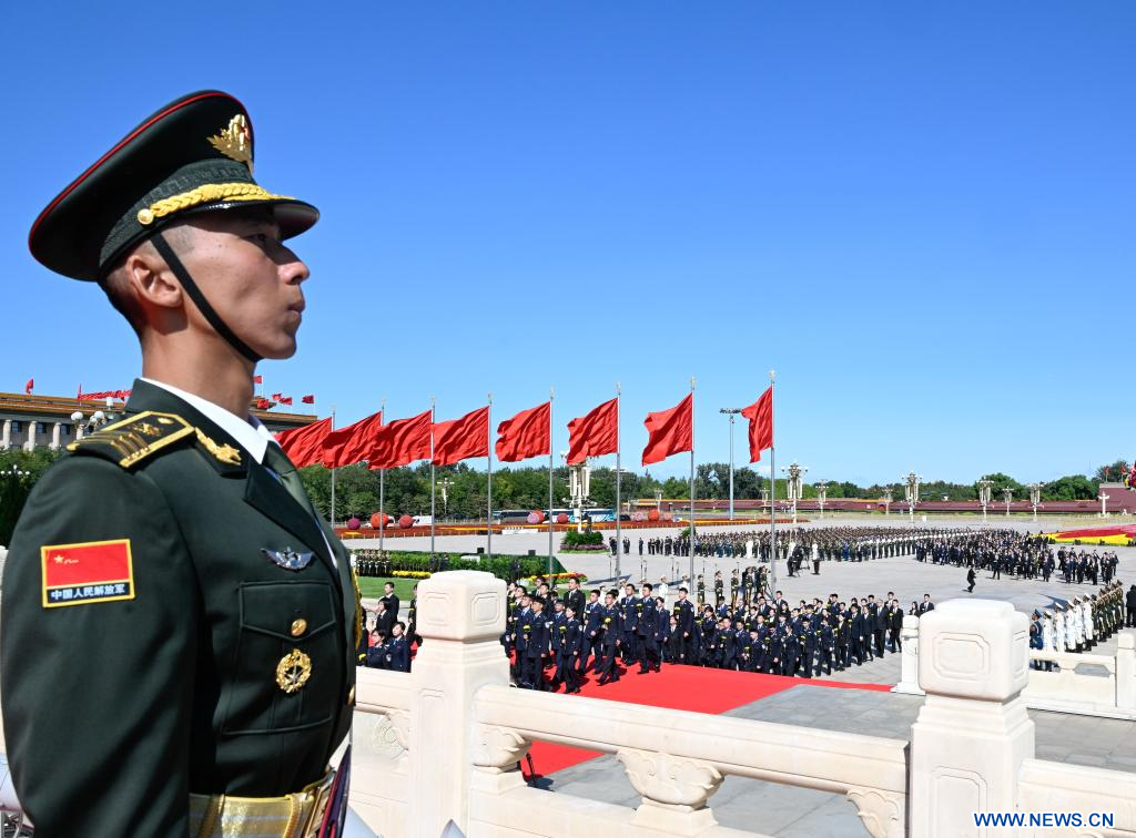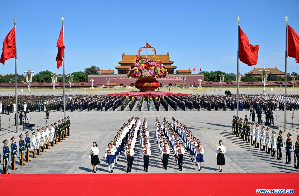 BEIJING, 30 septiembre, 2023 (Xinhua) -- Una ceremonia para ofrendar cestas de flores a los héroes nacionales caídos para conmemorar el Día de los Mártires se lleva a cabo en la Plaza de Tian'anmen, en Beijing, capital de China, el 30 de septiembre de 2023. (Xinhua/Yue Yuewei)