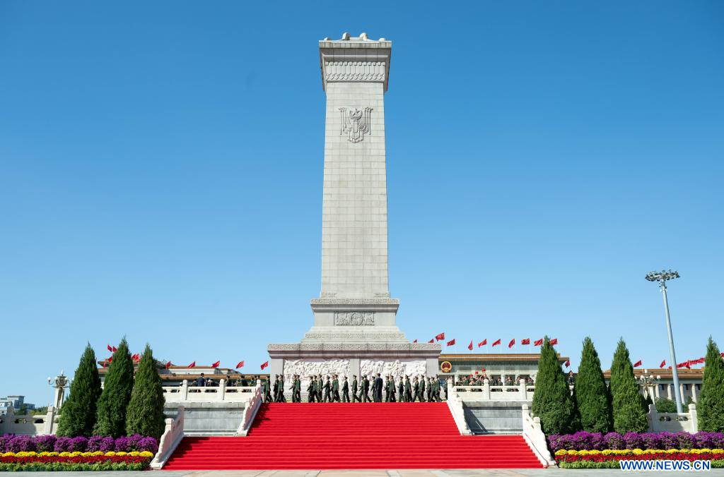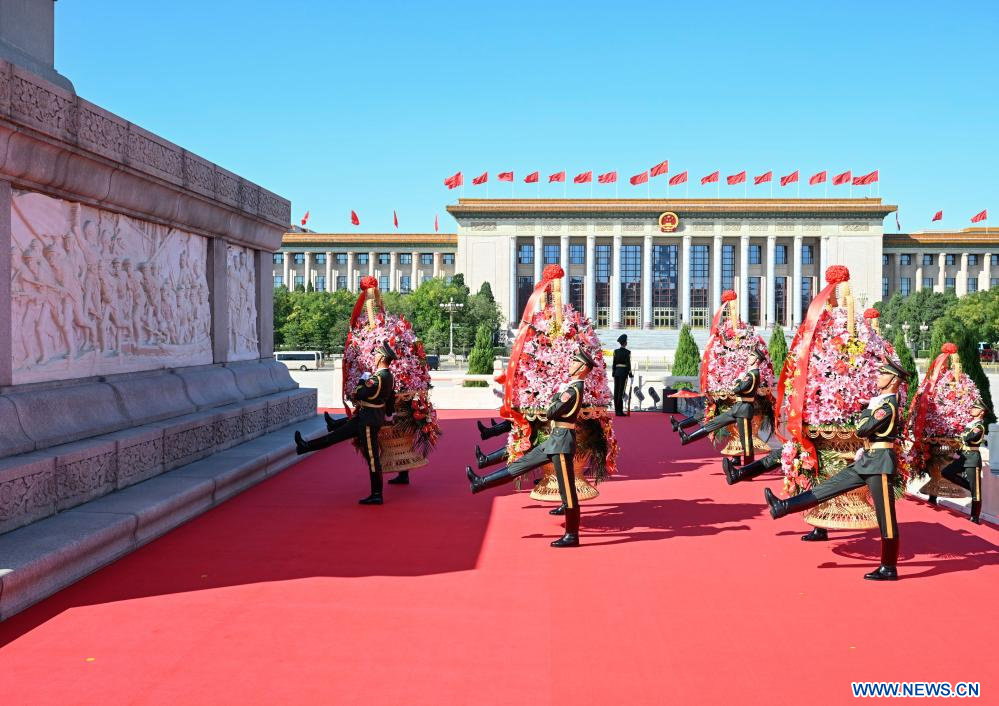 BEIJING, 30 septiembre, 2023 (Xinhua) -- Una ceremonia para ofrendar cestas de flores a los héroes nacionales caídos para conmemorar el Día de los Mártires se lleva a cabo en la Plaza de Tian'anmen, en Beijing, capital de China, el 30 de septiembre de 2023. (Xinhua/Shen Hong)