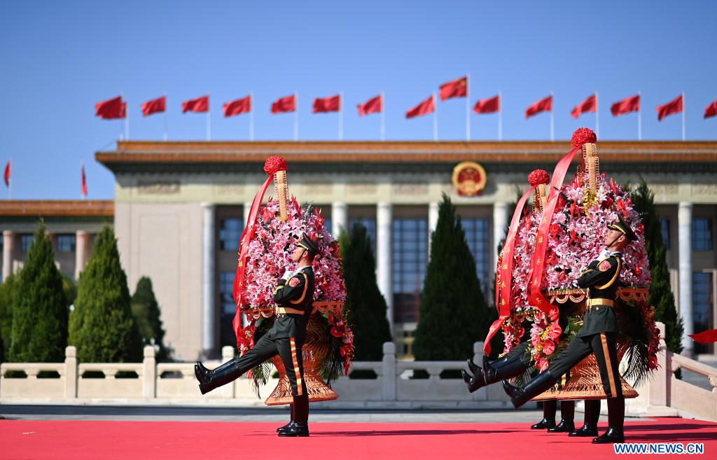 BEIJING, 30 septiembre, 2023 (Xinhua) -- Una ceremonia para ofrendar cestas de flores a los héroes nacionales caídos para conmemorar el Día de los Mártires se lleva a cabo en la Plaza de Tian'anmen, en Beijing, capital de China, el 30 de septiembre de 2023. (Xinhua/Yin Bogu)