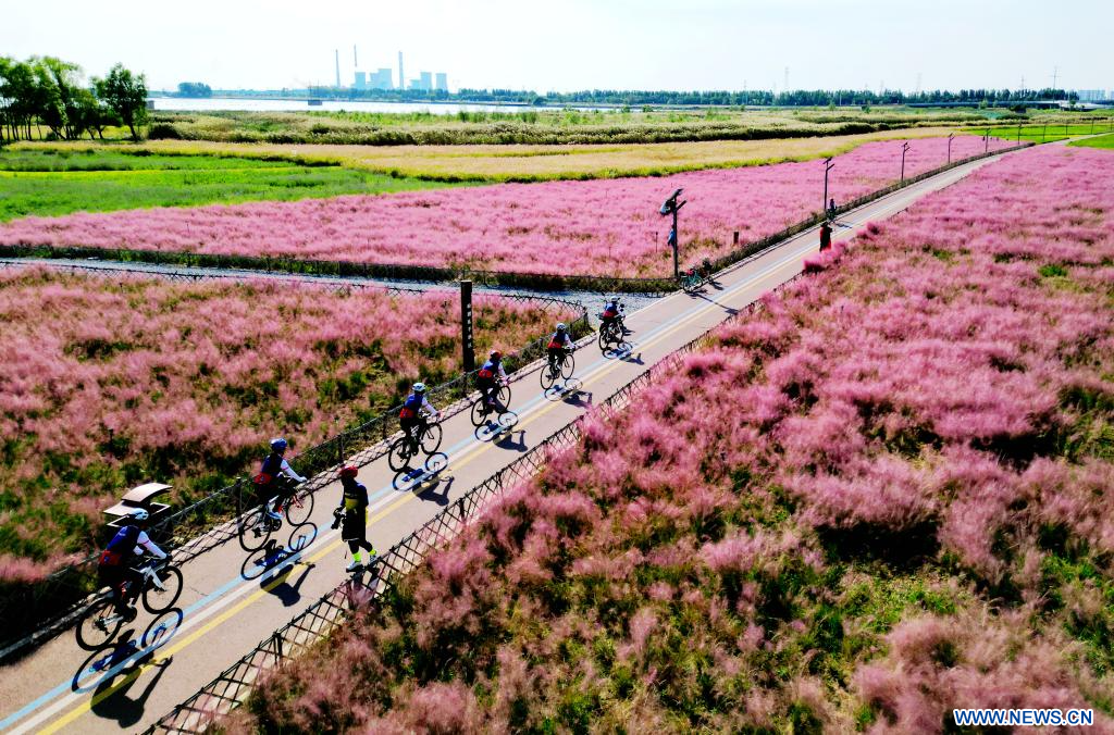 BEIJING, 1 octubre, 2023 (Xinhua) -- Personas montan bicicletas frente a una pradera del Humedal Gengjing, en la ciudad de Dongying, en la provincia de Shandong, en el este de China, el 1 de octubre de 2023. Personas a lo largo del país disfrutan de diferentes maneras el primer día de las vacaciones por el Día Nacional. (Xinhua/Liu Zhifeng)