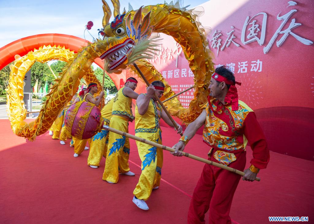 BEIJING, 1 octubre, 2023 (Xinhua) -- Una presentación de la danza del dragón es montada en una plaza, en Haian, en la provincia de Jiangsu, en el este de China, el 1 de octubre de 2023. Personas a lo largo del país disfrutan de diferentes maneras el primer día de las vacaciones por el Día Nacional. (Xinhua/Zhai Huiyong)