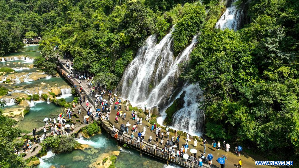 BEIJING, 1 octubre, 2023 (Xinhua) -- Vista aérea del 1 de octubre de 2023 de turistas visitando el punto escénico Xiaoqikong, en el distrito de Libo, en la provincia de Guizhou, en el suroeste de China. Personas a lo largo del país disfrutan de diferentes maneras el primer día de las vacaciones por el Día Nacional. (Xinhua/Yuan Fuhong)