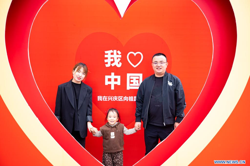 BEIJING, 1 octubre, 2023 (Xinhua) -- Personas posan para una fotografía cerca de la torre de tambor, en Yinchuan, en la región autónoma de la etnia hui de Ningxia, en el noroeste de China, el 1 de octubre de 2023. Personas a lo largo del país disfrutan de diferentes maneras el primer día de las vacaciones por el Día Nacional. (Xinhua/Yang Zhisen)