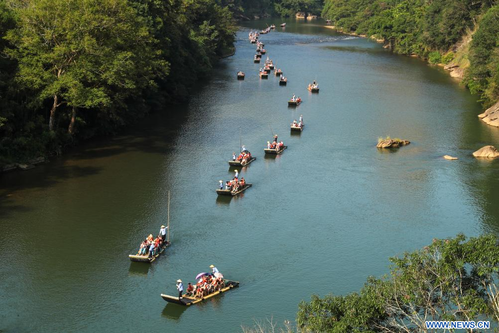 BEIJING, 1 octubre, 2023 (Xinhua) -- Turistas disfrutan la vista de balsas de bambú a lo largo del arroyo de Jiuqu en la montaña de Wuyi, en la provincia de Fujian, en el sureste de China, el 1 de octubre de 2023. Personas a lo largo del país disfrutan de diferentes maneras el primer día de las vacaciones por el Día Nacional. (Xinhua/Qiu Ruquan)