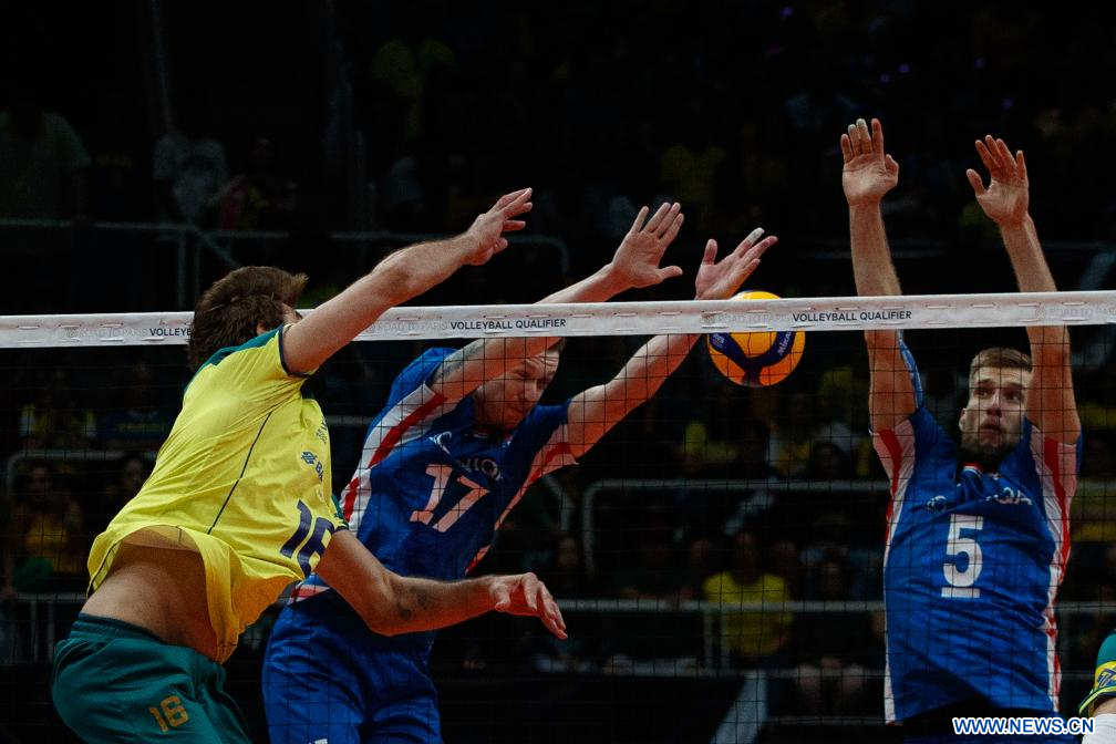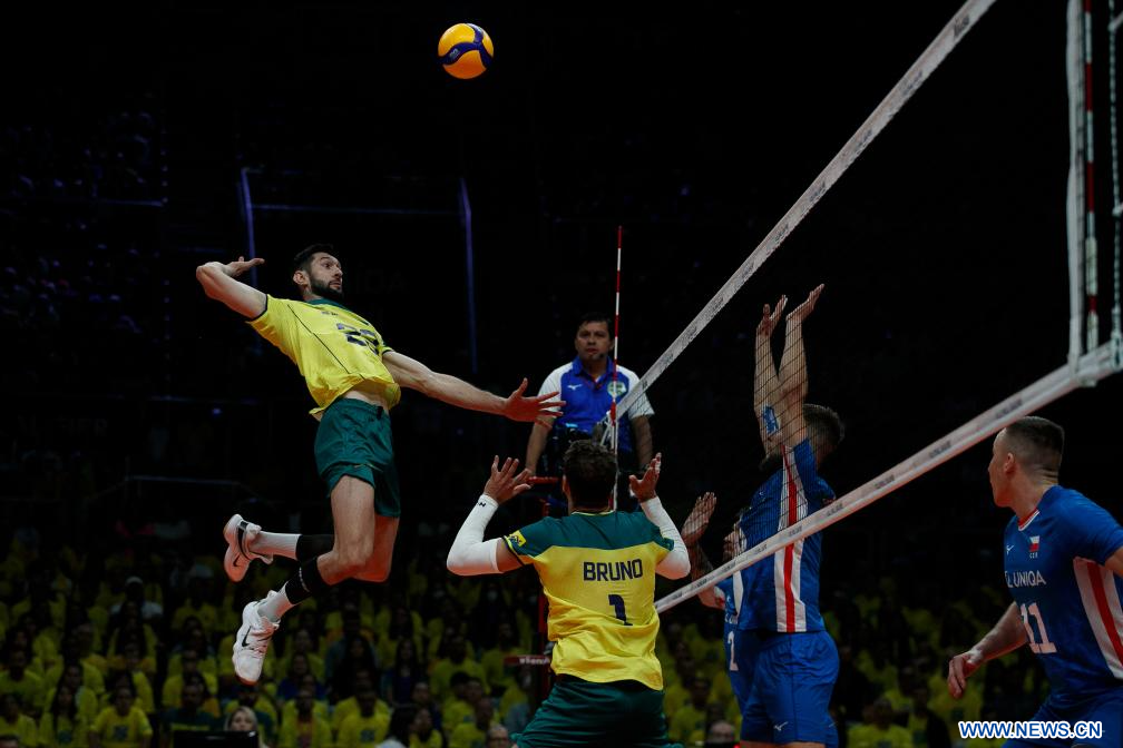 RIO DE JANEIRO, 1 octubre, 2023 (Xinhua) -- Flávio (i-arriba), de Brasil, compite durante los Juegos Preolímpicos de Voleibol Masculino 2023 ante República Checa, en el Gimnasio Maracanazinho, en Río de Janeiro, Brasil, el 1 de octubre de 2023. (Xinhua/Claudia Martini)