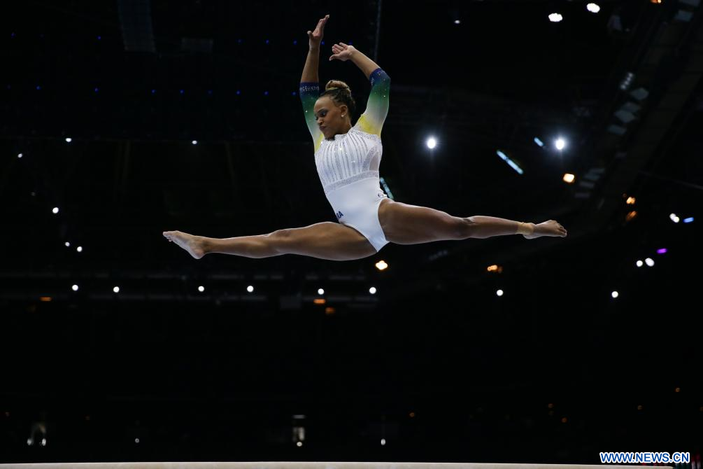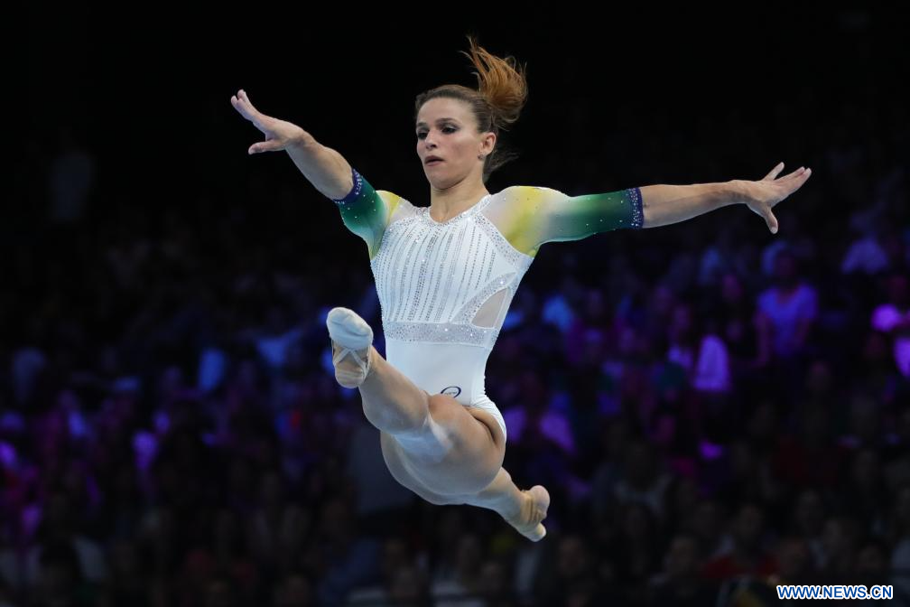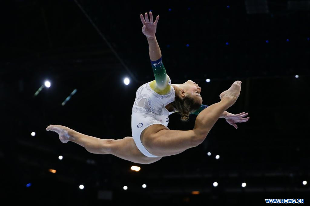 AMBERES, 2 octubre, 2023 (Xinhua) -- Jade Barbosa, de Brasil, compite en el ejercicio de suelo durante las clasificaciones femeninas del Campeonato Mundial de Gimnasia Artística 2023, en Amberes, Bélgica, el 2 de octubre de 2023. (Xinhua/Zheng Huansong)