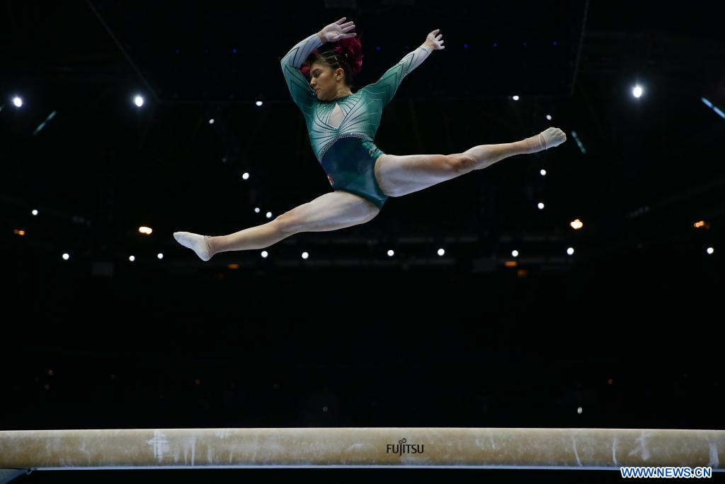 AMBERES, 2 octubre, 2023 (Xinhua) -- Alexa Moreno, de México, compite en la barra de equilibrio durante las clasificaciones femeninas del Campeonato Mundial de Gimnasia Artística 2023, en Amberes, Bélgica, el 2 de octubre de 2023. (Xinhua/Zheng Huansong)