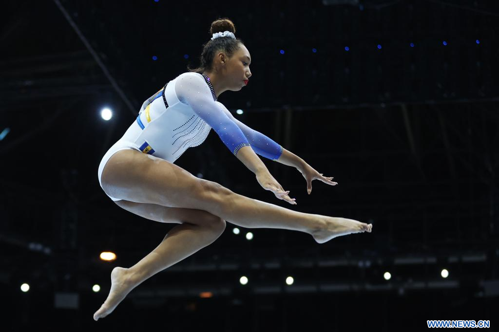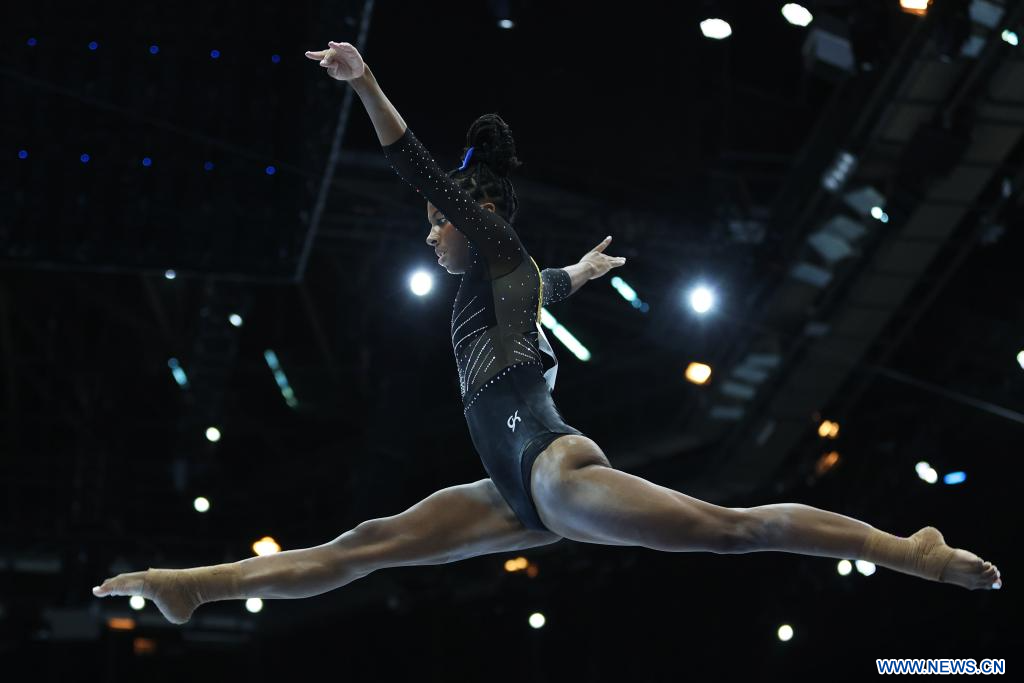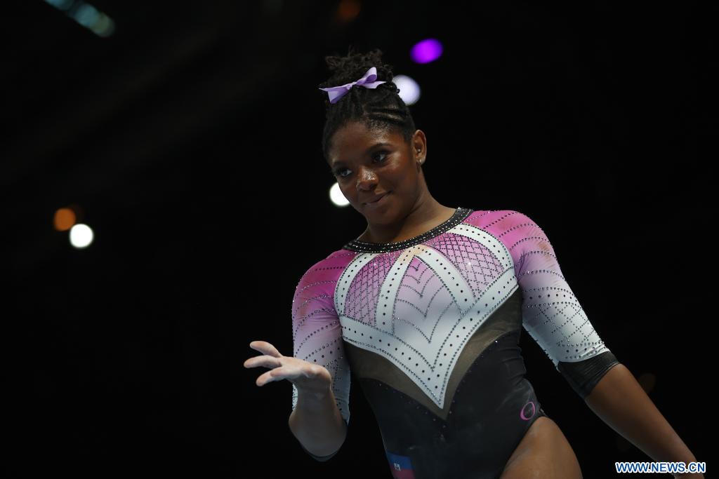 AMBERES, 3 octubre, 2023 (Xinhua) -- Imagen del 2 de octubre de 2023 de Lynnzee Brown, de Haití, compitiendo durante el ejercicio de suelo de las clasificaciones femeninas del Campeonato Mundial de Gimnasia Artística 2023, en Amberes, Bélgica. (Xinhua/Zhao Dingzhe)