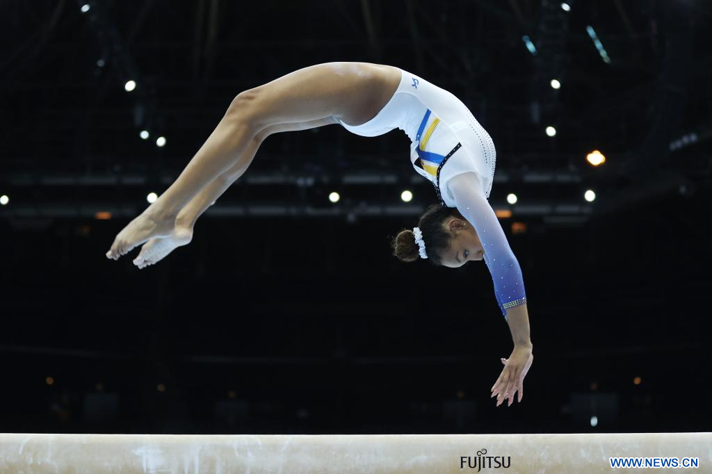 AMBERES, 3 octubre, 2023 (Xinhua) -- Imagen del 2 de octubre de 2023 Anya Pilgrim, de Barbados, compitiendo en la barra de equilibrio durante las clasificaciones femeninas del Campeonato Mundial de Gimnasia Artística 2023, en Amberes, Bélgica. (Xinhua/Zhao Dingzhe)