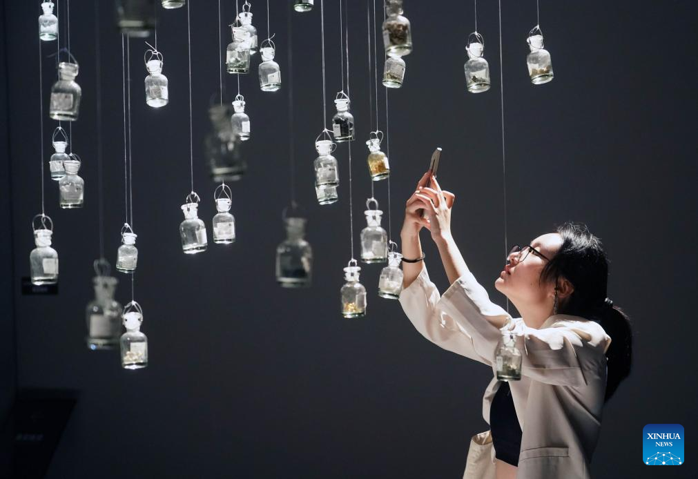 BEIJING, 2 octubre, 2023 (Xinhua) -- Una visitante toma fotografías en una exposición de ciencia y arte en el Museo de Arte Times de Beijing, en Beijing, capital de China, el 2 de octubre de 2023. Personas de todo el país participan en actividades culturales para enriquecer su vida vacacional durante las vacaciones por el Día Nacional. (Xinhua/Ren Chao)
