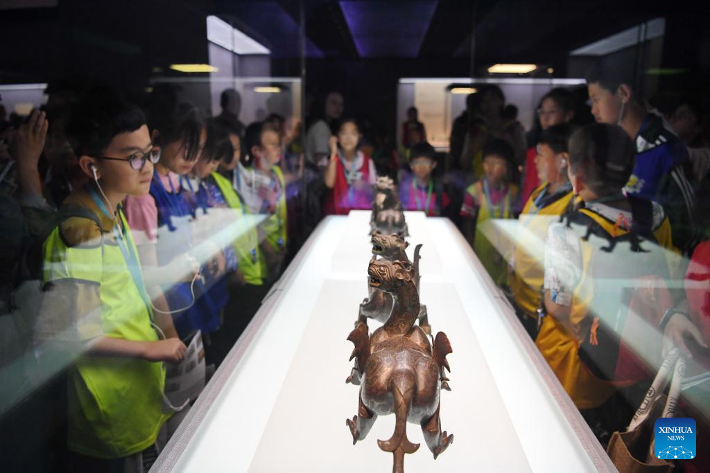BEIJING, 2 octubre, 2023 (Xinhua) -- Estudiantes visitan el Museo de Hebei, en Shijiazhuang, en la provincia de Hebei, en el norte de China, el 2 de octubre de 2023. Personas de todo el país participan en actividades culturales para enriquecer su vida vacacional durante las vacaciones por el Día Nacional. (Xinhua/Mu Yu)