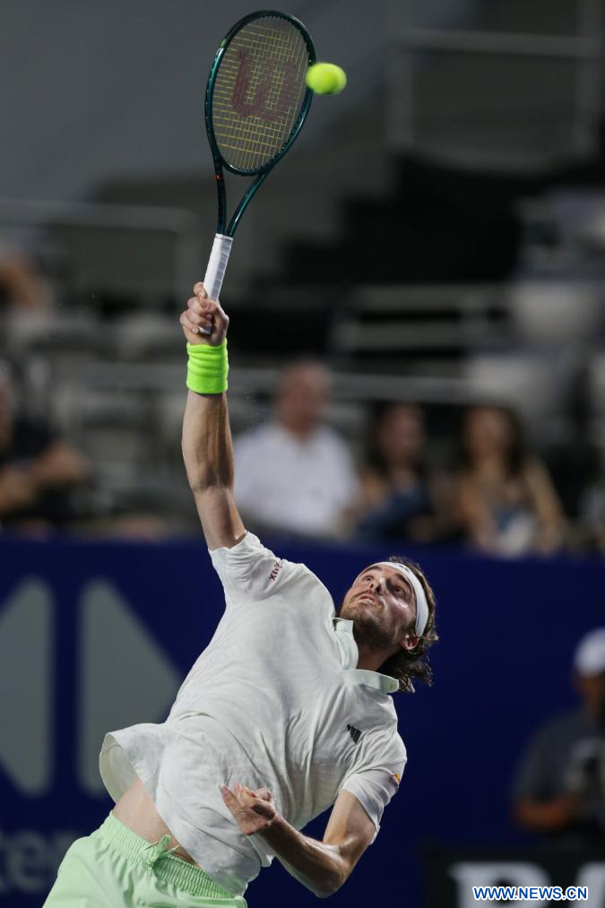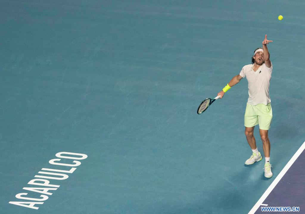 ACAPULCO, 1 marzo, 2024 (Xinhua) -- Imagen del 29 de febrero de 2024 de Stefanos Tsitsipas, de Grecia, sirviendo la pelota durante el partido de cuartos de final ante Alex De Minaur, de Australia, en el torneo de tenis Abierto Mexicano 2024 de la ATP, en Acapulco, México. (Xinhua/Li Mengxin)