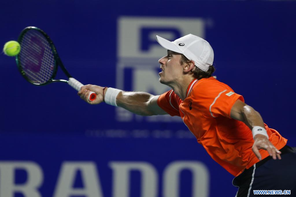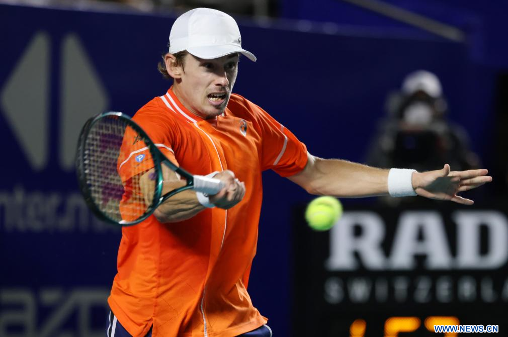 ACAPULCO, 1 marzo, 2024 (Xinhua) -- Imagen del 29 de febrero de 2024 de Alex De Minaur, de Australia, devolviendo la pelota durante el partido de cuartos de final ante Stefanos Tsitsipas, de Grecia, en el torneo de tenis Abierto Mexicano 2024 de la ATP, en Acapulco, México. (Xinhua/Li Mengxin)
