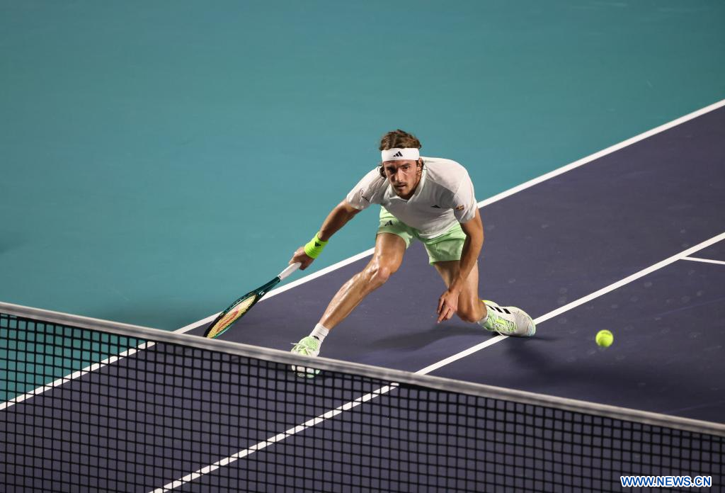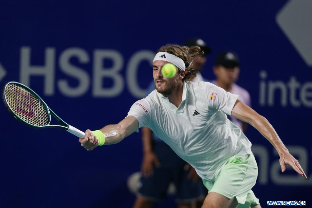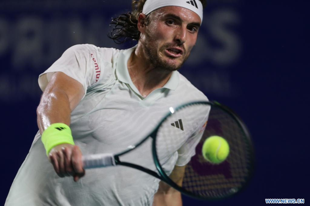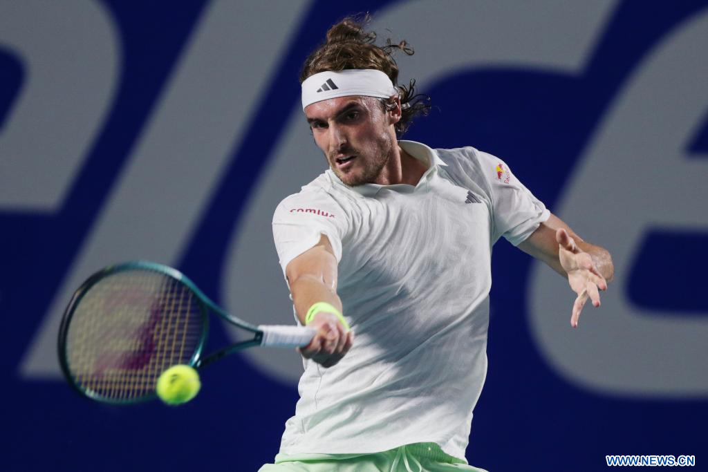 ACAPULCO, 1 marzo, 2024 (Xinhua) -- Imagen del 29 de febrero de 2024 de Stefanos Tsitsipas, de Grecia, devolviendo la pelota durante el partido de cuartos de final ante Alex De Minaur, de Australia, en el torneo de tenis Abierto Mexicano 2024 de la ATP, en Acapulco, México. (Xinhua/Li Mengxin)