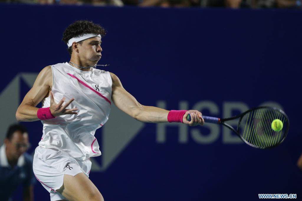 ACAPULCO, 1 marzo, 2024 (Xinhua) -- Ben Shelton, de Estados Unidos, devuelve la pelota durante el partido de cuartos de final ante Casper Ruud, de Noruega, en el torneo de tenis Abierto Mexicano 2024 de la ATP, en Acapulco, México, el 1 de marzo de 2024. (Xinhua/Francisco Cañedo)