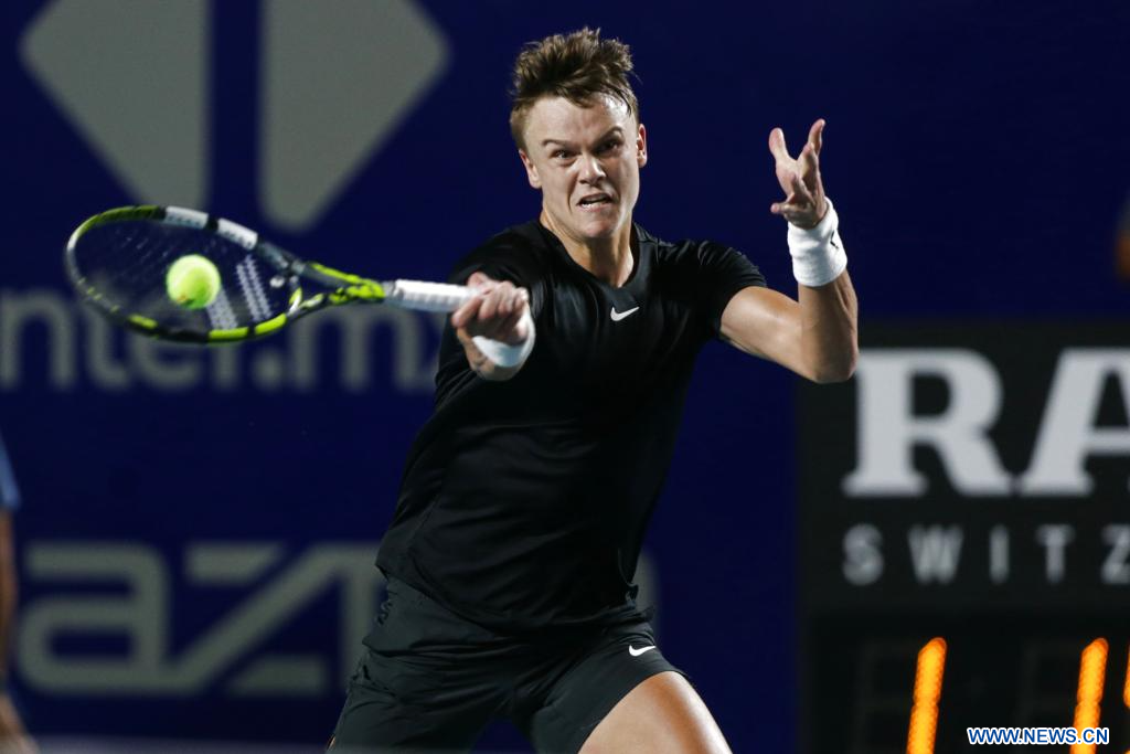 ACAPULCO, 1 marzo, 2024 (Xinhua) -- Imagen del 29 de febrero de 2024 de Holger Rune, de Dinamarca, devolviendo la pelota durante el partido de cuartos de final individual masculino entre Holger Rune, de Dinamarca, y Dominik Koepfer, de Alemania, en el torneo de tenis Abierto Mexicano 2024 de la ATP, en Acapulco, México. (Xinhua/Francisco Cañedo)