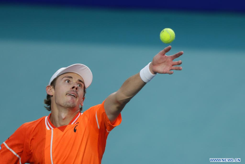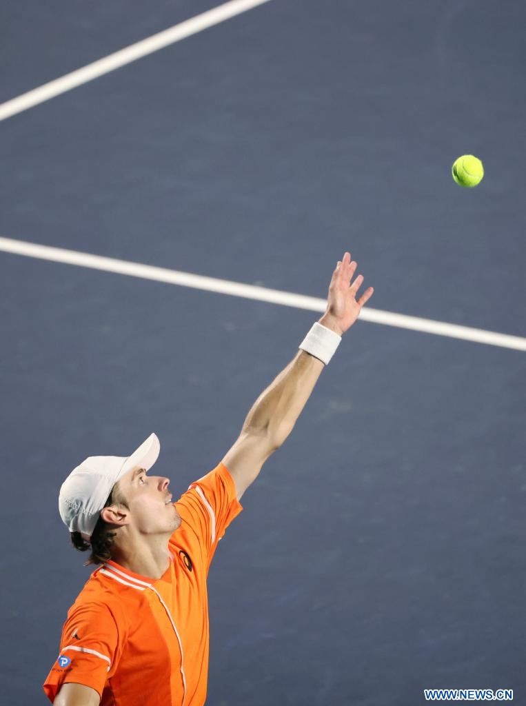 ACAPULCO, 1 marzo, 2024 (Xinhua) -- Imagen del 29 de febrero de 2024 de Alex De Minaur, de Australia, sirviendo la pelota durante el partido de cuartos de final ante Stefanos Tsitsipas, de Grecia, en el torneo de tenis Abierto Mexicano 2024 de la ATP, en Acapulco, México. (Xinhua/Li Mengxin)